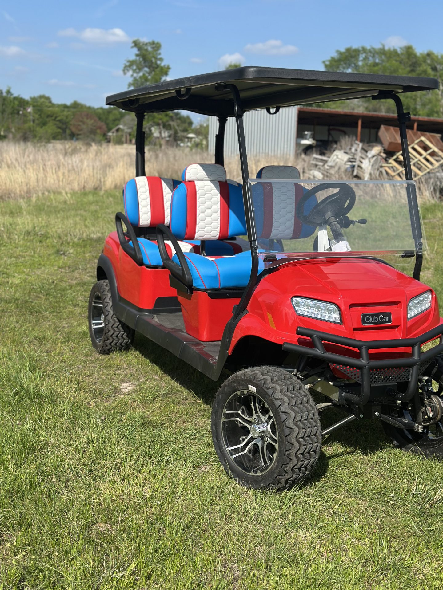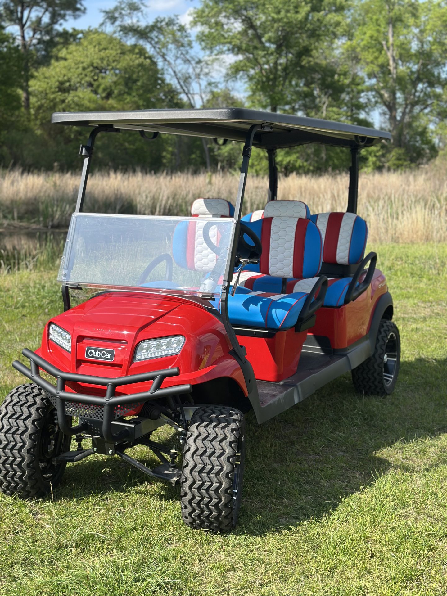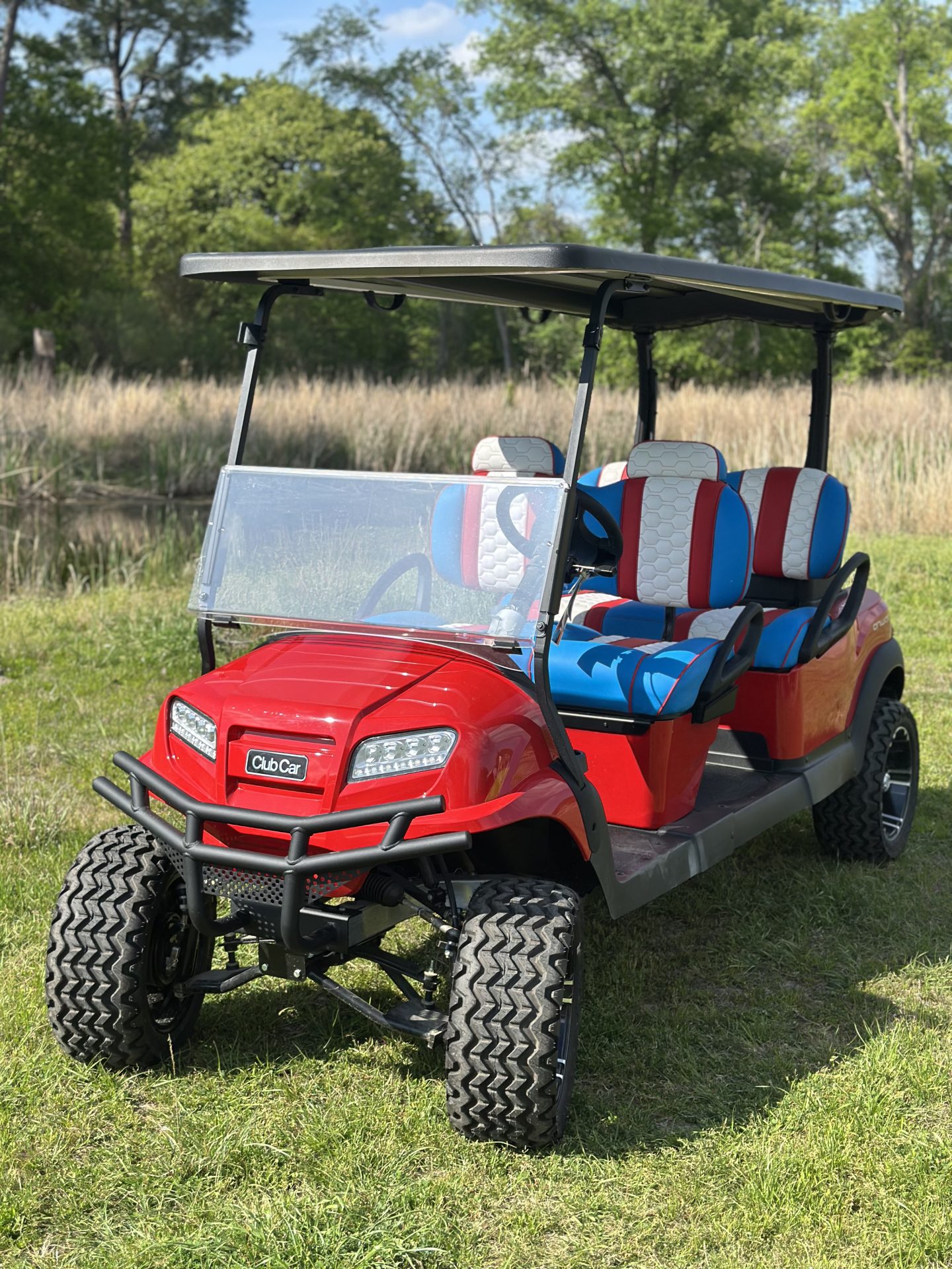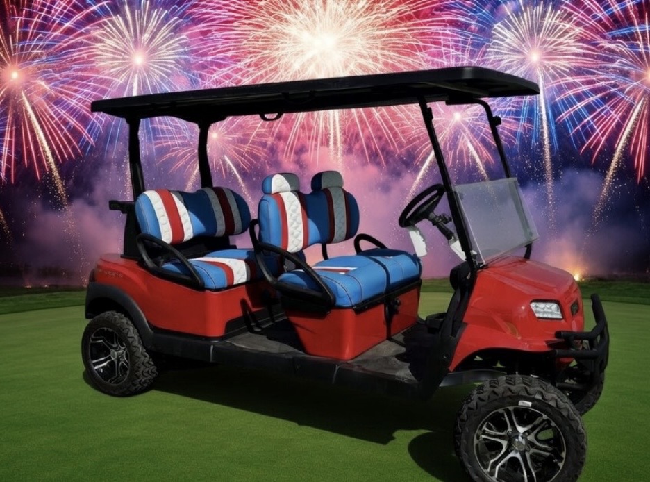 Bring the summer in the right way with a Captain America, Club Car custom Lazy Life Seats for facing forward, gas, a true showstopper parade leader