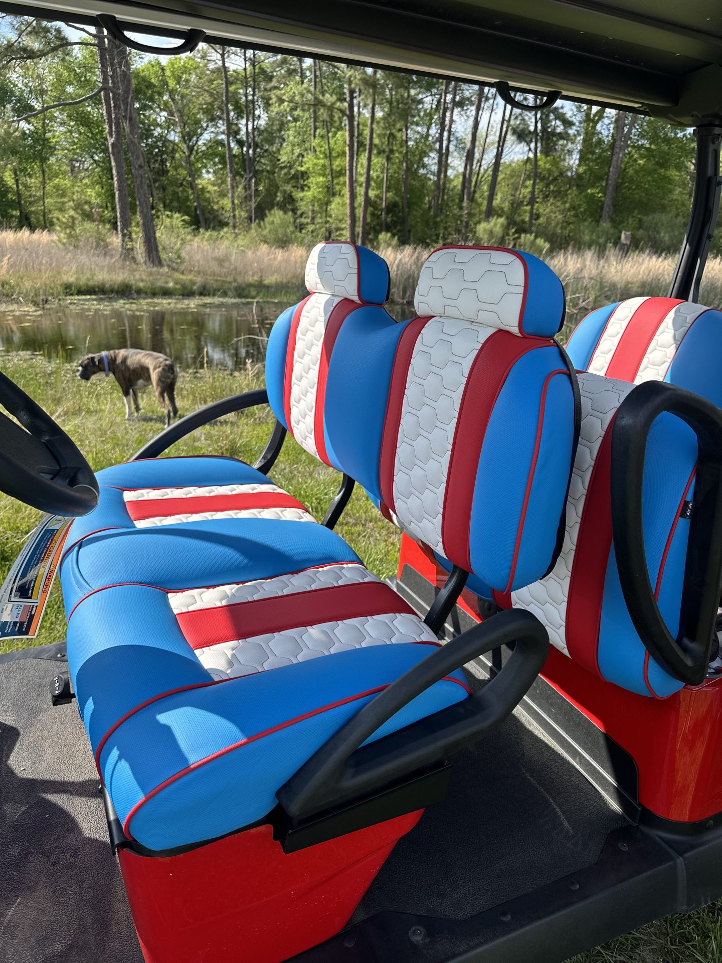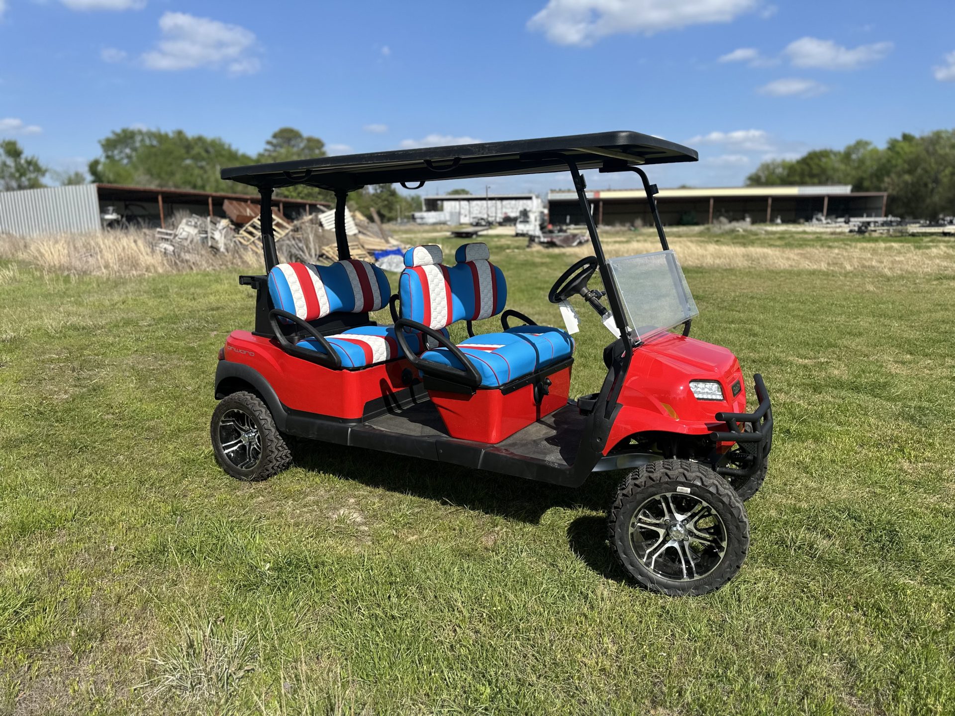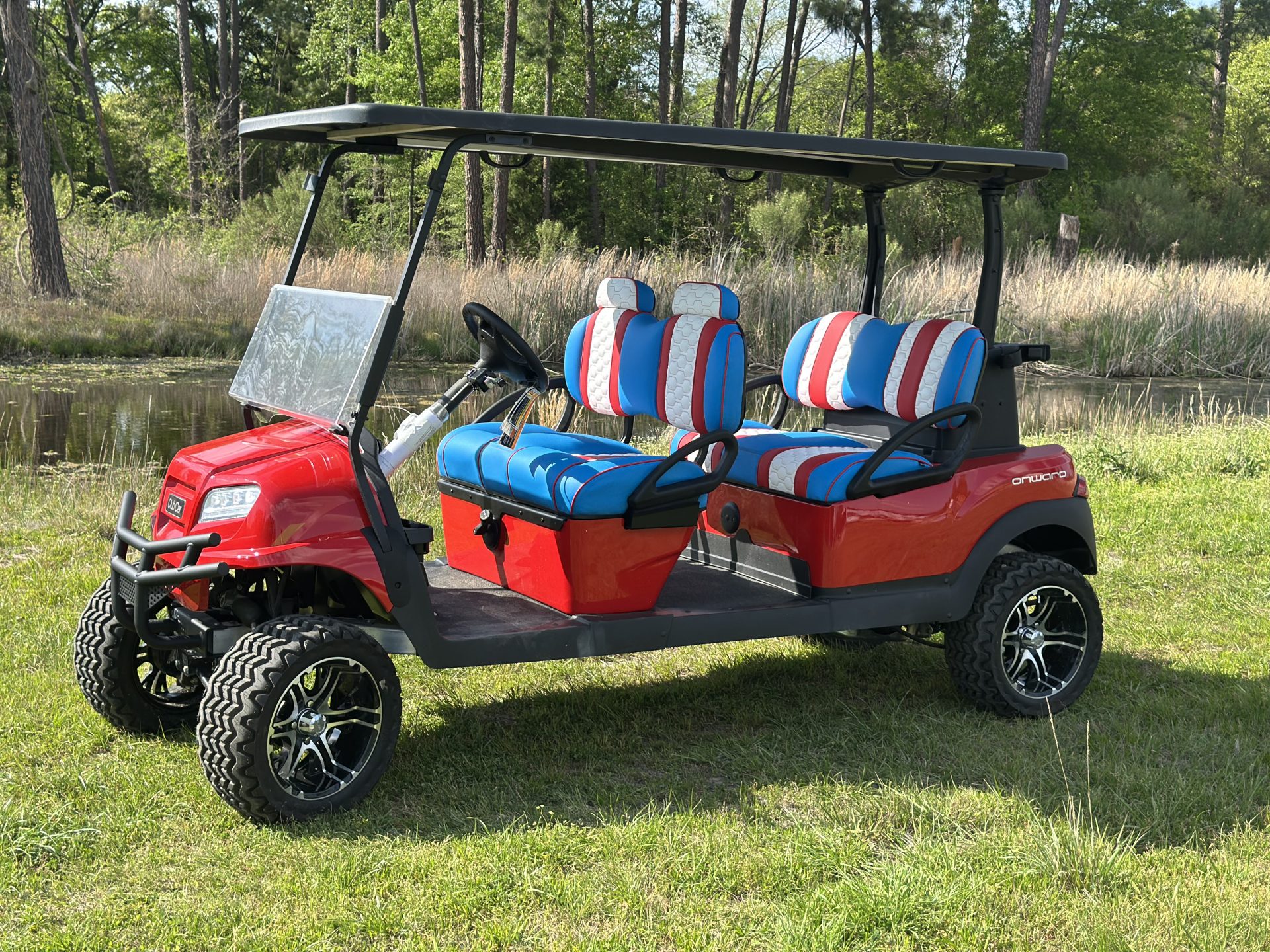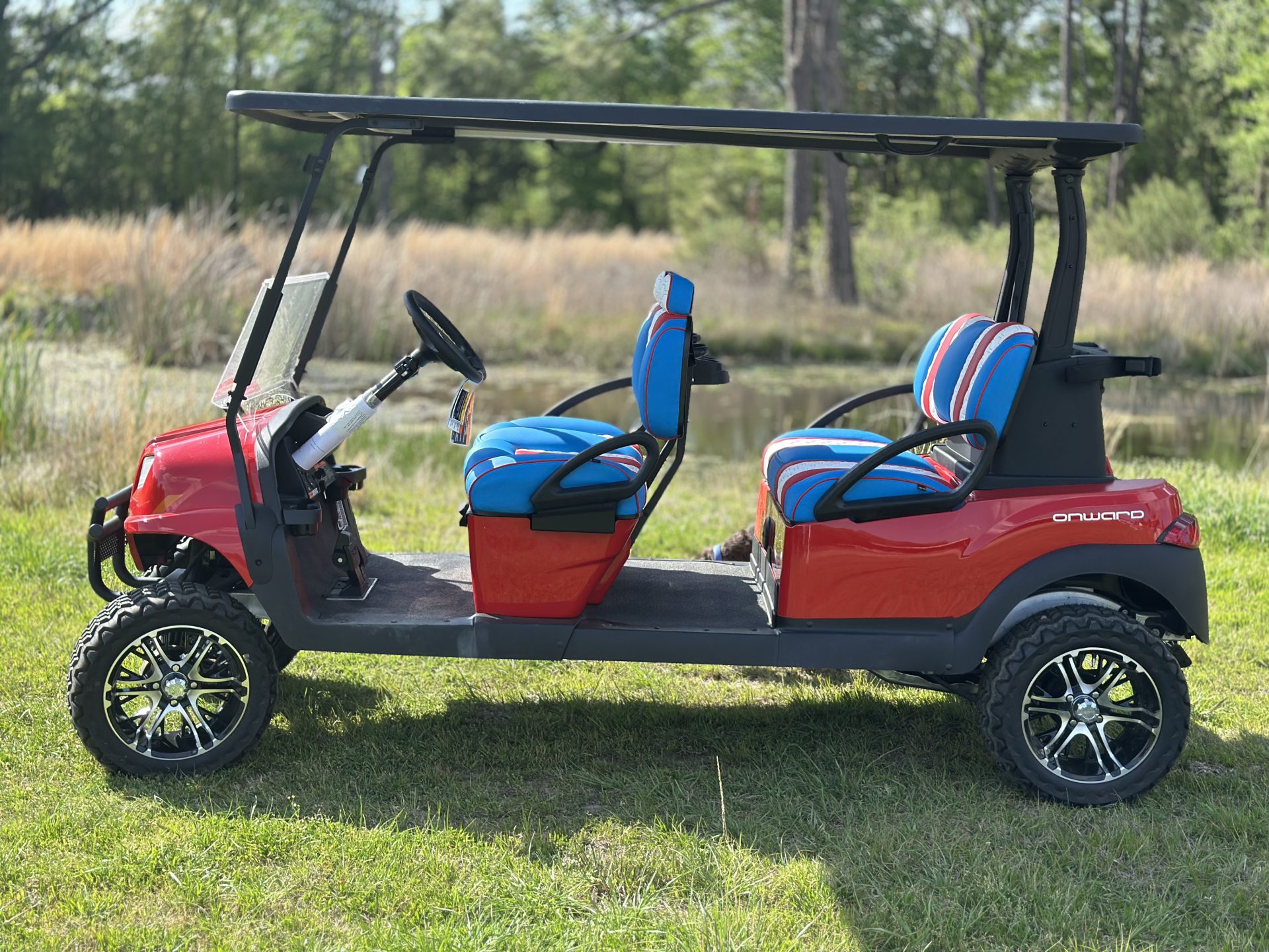 Bring the summer in the right way with a Captain America, Club Car custom Lazy Life Seats for facing forward, gas, a true showstopper parade leader